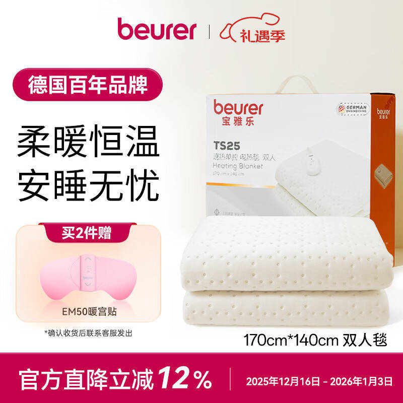 BEURER德国宝雅乐 电褥子单双人可水洗电热毯智能控温除螨 TS25双人毯¥227京东好评率100%无理由退换旗舰店购买
